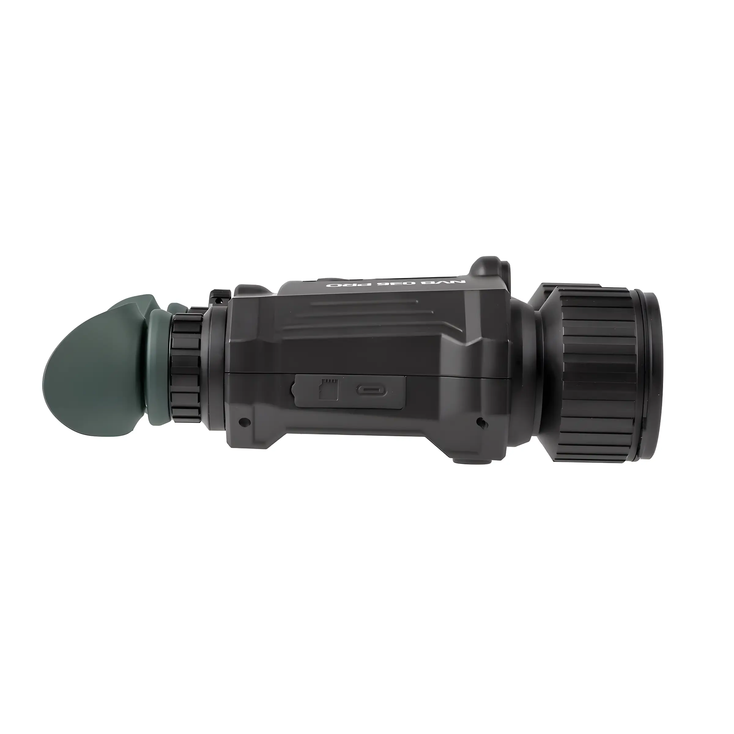 Бинокулярная схема наблюдения значительно снижает нагрузку на зрение по сравнению с монокулярами — мозг получает привычную картинку для двух глаз. Межзрачковое расстояние регулируется в диапазоне 60-70 мм, а диоптрийная коррекция ±6 дптр позволяет использовать прибор без очков. Вес 800 г и габариты 180x125x65 мм делают его достаточно мобильным для ходовой охоты, но для длительных наблюдений на максимальном увеличении предусмотрена резьба 1/4" под штатив. Кнопки управления вынесены на верхнюю панель и легко находятся на ощупь.