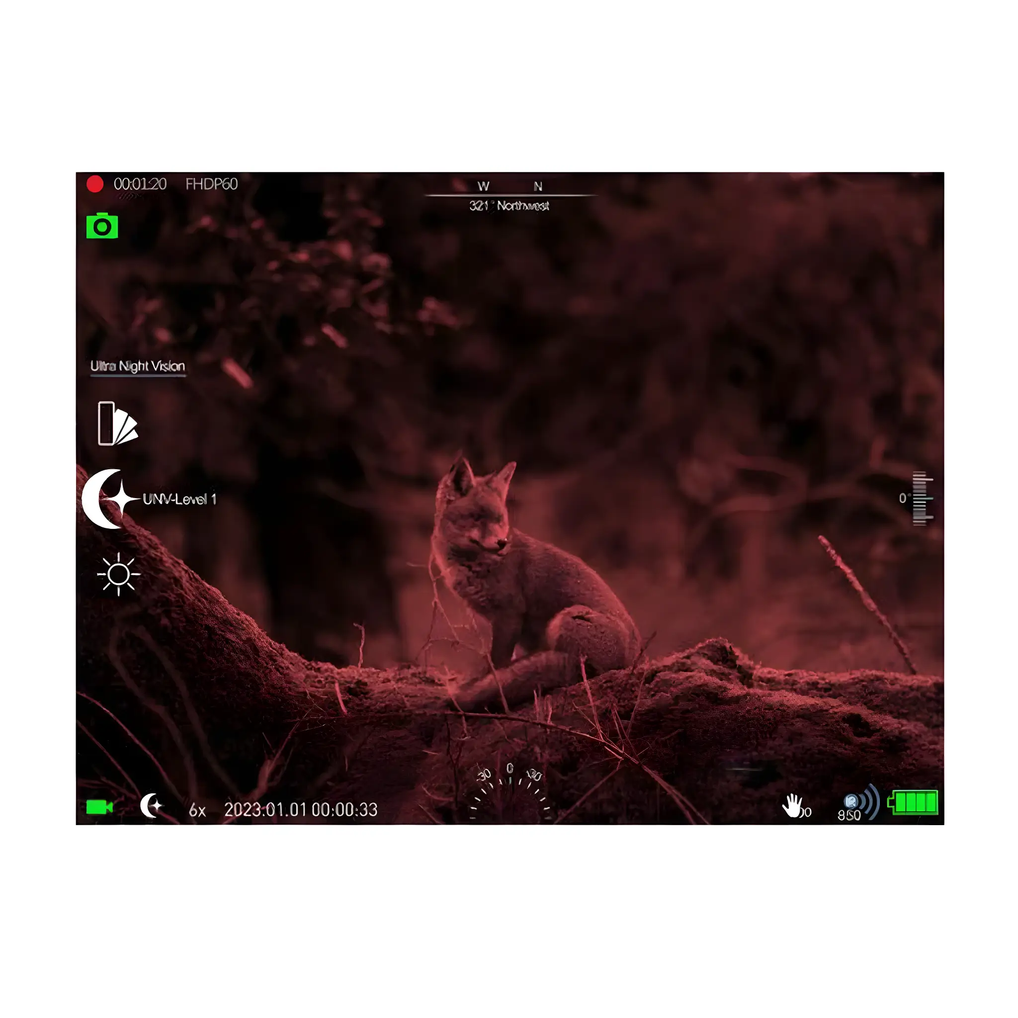 В основе прибора лежит сенсор CMOS 1/2,8" с высокой частотой обновления 120 Гц. Это обеспечивает плавную картинку без шлейфов и задержек даже при наблюдении за быстро движущимися объектами. Изображение выводится на морозостойкий OLED-дисплей 0,39" с разрешением 1024x768, который дает глубокий черный цвет и высокий контраст. Для полной темноты предусмотрена дальнобойная ИК-подсветка с длиной волны 850 нм. У нее три уровня мощности и фокусируемый луч, что позволяет четко видеть цели на дистанции до 400 метров в темноте и до 1200 метров при свете луны. Шесть цветовых палитр помогают адаптировать картинку под конкретный фон и условия наблюдения.