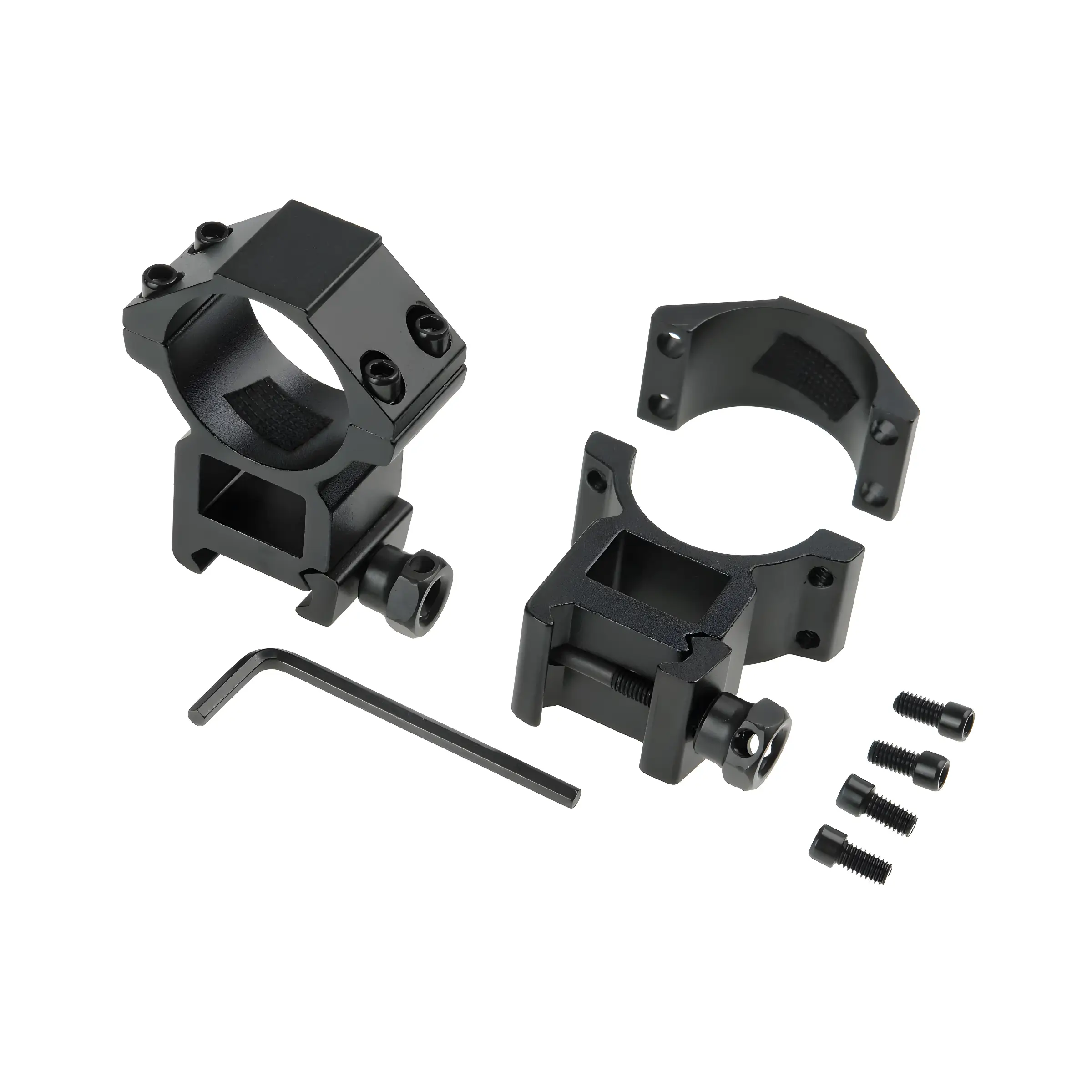 Изделие выполнено из алюминиевого сплава, который сочетает необходимую прочность с легкостью. Вес комплекта составляет всего 110 г, поэтому установка крепления практически не влияет на общий баланс оружия. Анодированное покрытие защищает металл от коррозии и царапин при эксплуатации в полевых условиях.