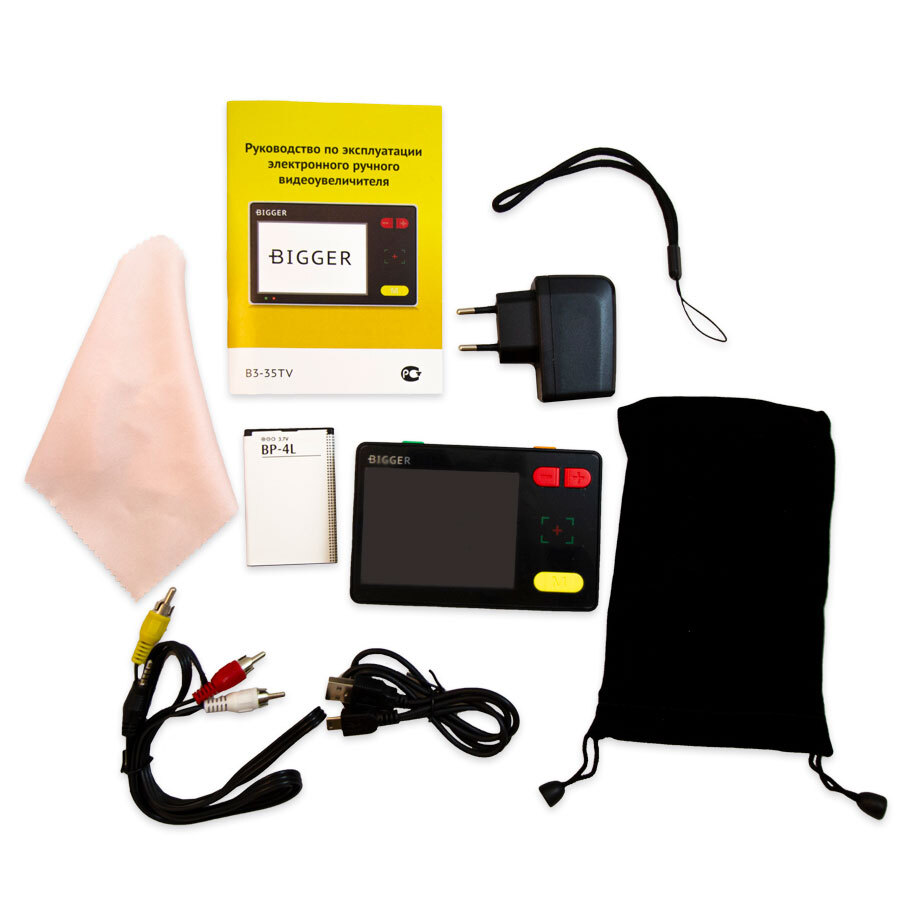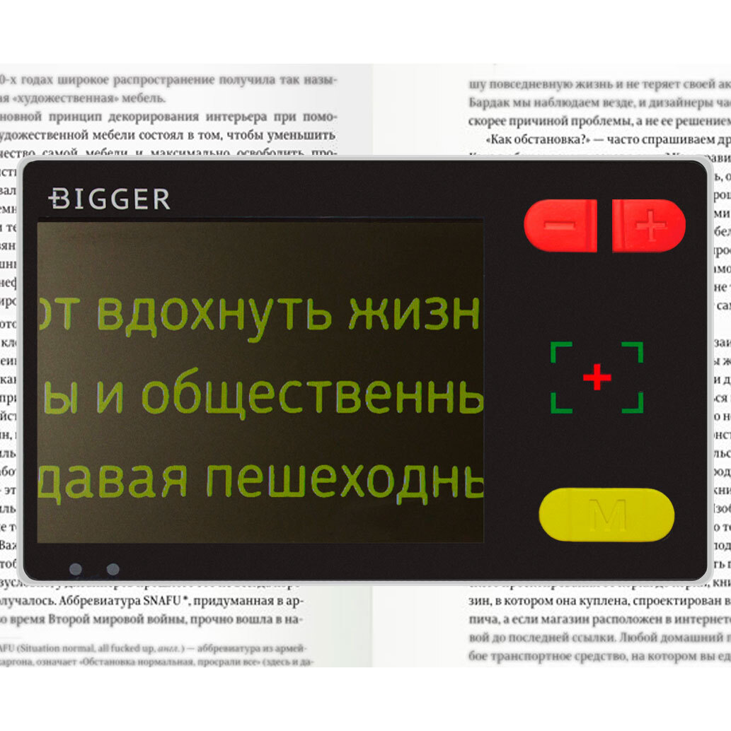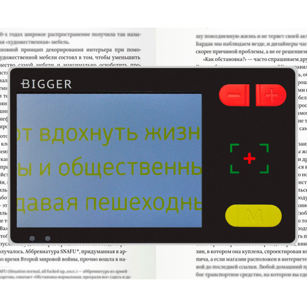 Электронная лупа Bigger B3-35TV – многофункциональный гаджет для чтения текста под мощным переменным увеличением. Прибор является усовершенствованной версией модели Bigger B2-35TV. В отличие от своей предшественницы, эта лупа дает более широкий спектр увеличений – до 32 крат. Кратность изменяется плавно, без шагов. При этом устройство осталось таким же легким и компактным – его можно взять с собой для чтения книг в дороге, захватить на работу, в магазин или библиотеку. Изображение демонстрируется на удобном ЖК-экране с 5 уровнями яркости. При необходимости картинку можно вывести на внешний монитор.