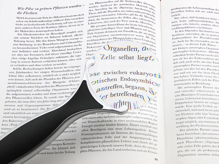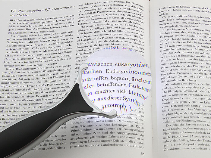 Лупа дает 3-кратное увеличение, которое позволяет с комфортом рассматривать мелкие шрифты и работать с небольшими предметами. Линза и корпус лупы изготовлены из пластика.