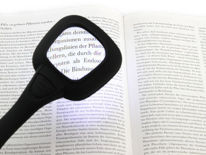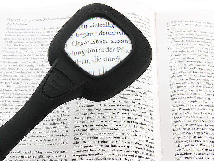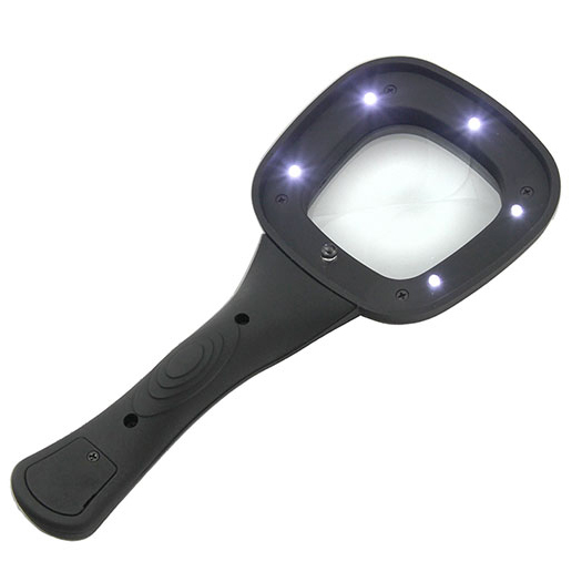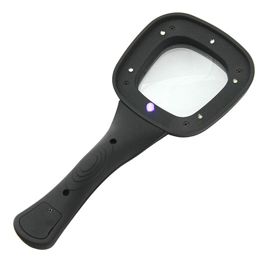 Система встроенного освещения состоит из шести светодиодов. Они расположены по периметру линзы. Пять светодиодов излучают обычный белый свет, а шестой – ультрафиолетовый. За счет этого лупу можно использовать для распознавания фальшивых банкнот. Для питания подсветки используются четыре батарейки типа AG10. Переключатель подсветки расположен на ручке лупы.
