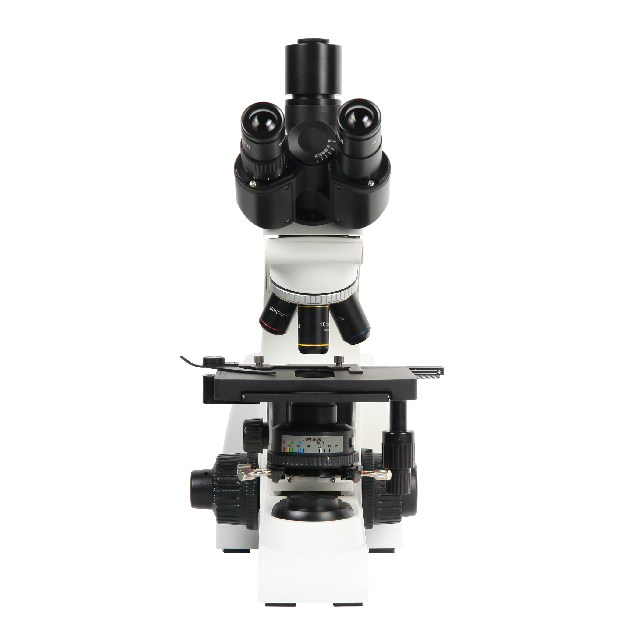 Револьверное устройство на 4 объектива позволяет разместить комплектные ахроматические объективы 4x/0.13; 10x/0.3; 40x/0.7; 100x/1.25 (oil) (с коррекцией на толщину покровного стекла 0,17 мм.)