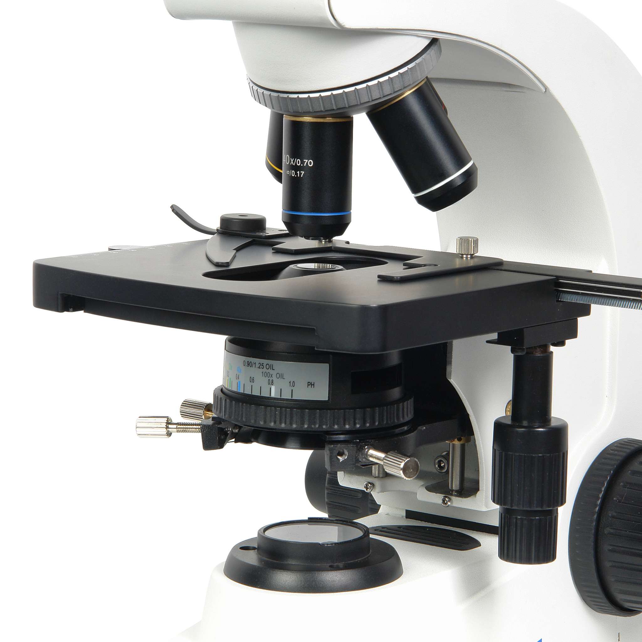 В комплект входит центрируемый конденсор светлого поля Аббе с лепестковой апертурной диафрагмой (10 лепестков) и удобной шкалой регулировки. Конденсор предназначен для формирования направленного пучка света нужного диаметра и регулирует контрастность освещения. Апертура конденсора 1,25, диапазон перемещения конденсора по высоте составляет 19 мм.