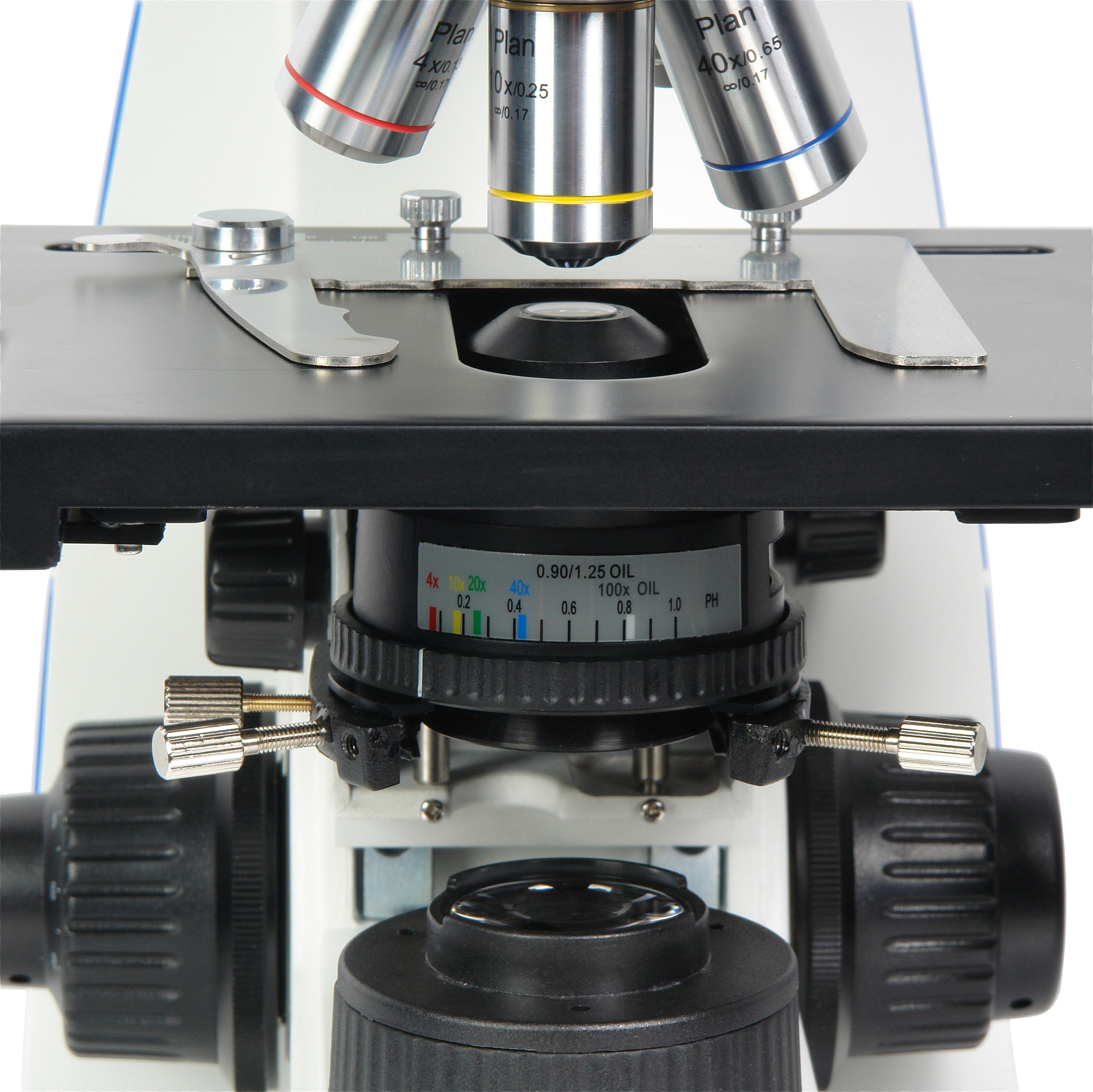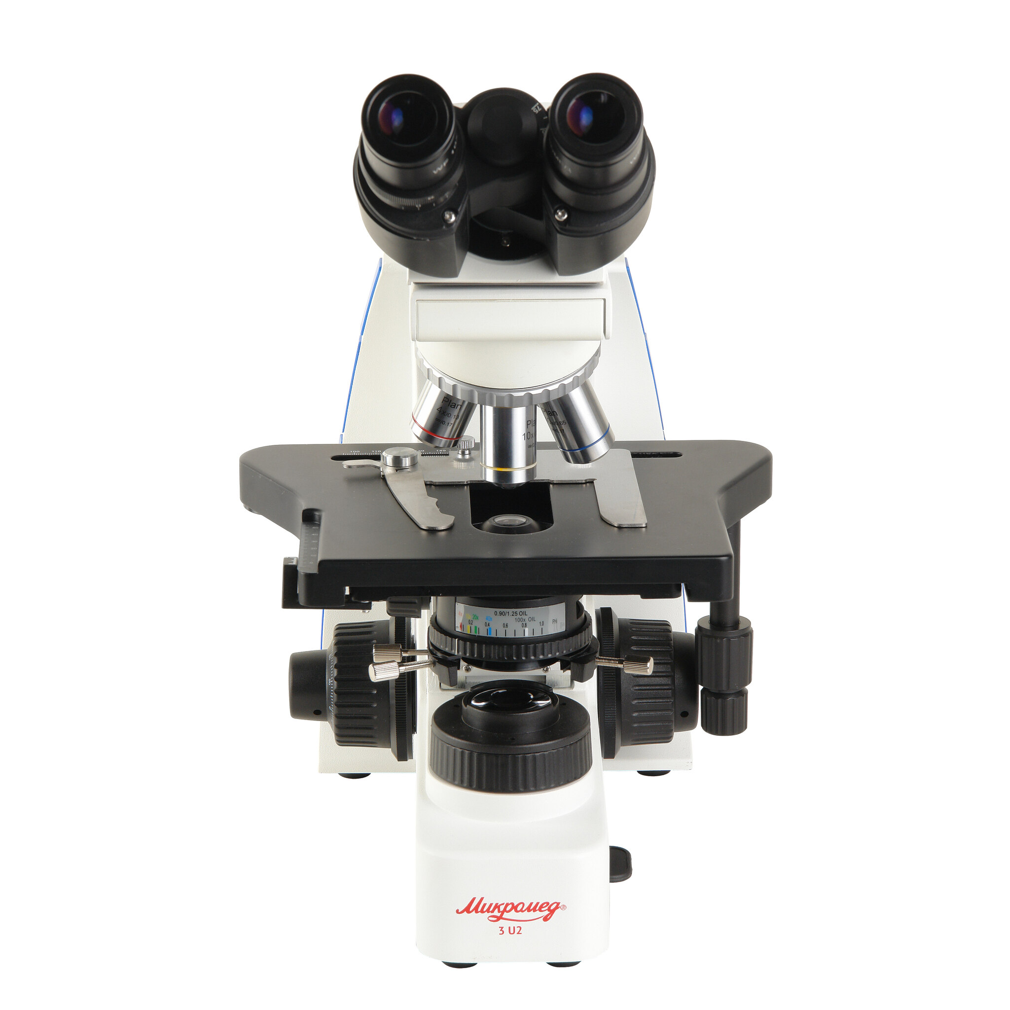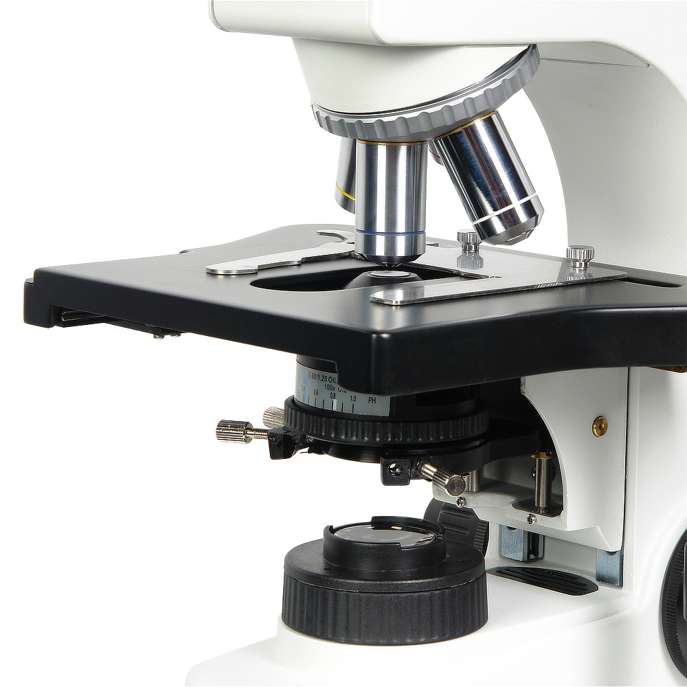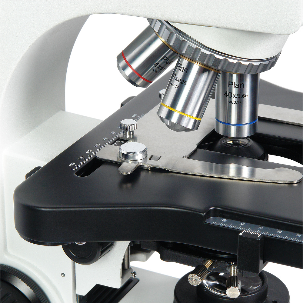 Револьверное устройство на 5 объективов, в комплекте четыре планахроматических объектива 4x/0.13; 10x/0.25; 40x/0.65; 100x/1.25 (oil) с коррекцией на толщину покровного стекла 0,17 мм. Дополнительно можно приобрести объектив, который лаборант выберет из линейки объективов, в зависимости от задачи наблюдений – 2х/0,06; 20х/0,45; 60х/0,80.