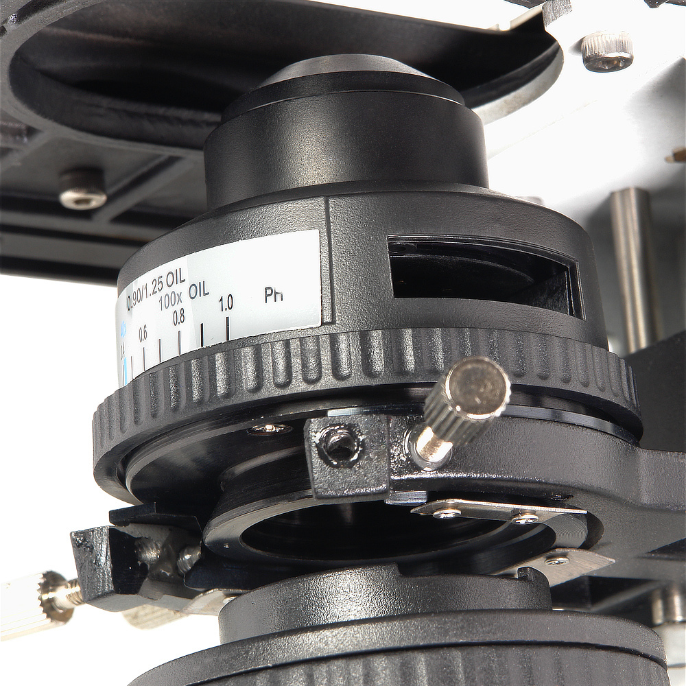 Центрируемый конденсор светлого поля Аббе с лепестковой апертурной диафрагмой помогает сформировать направленный пучок света нужного диаметра, регулируя таким образом контрастность освещения. Наибольшая числовая апертура конденсора 1,25 (на конденсор нанесена удобная шкала регулировки), диапазон перемещения по высоте – 19 мм.
