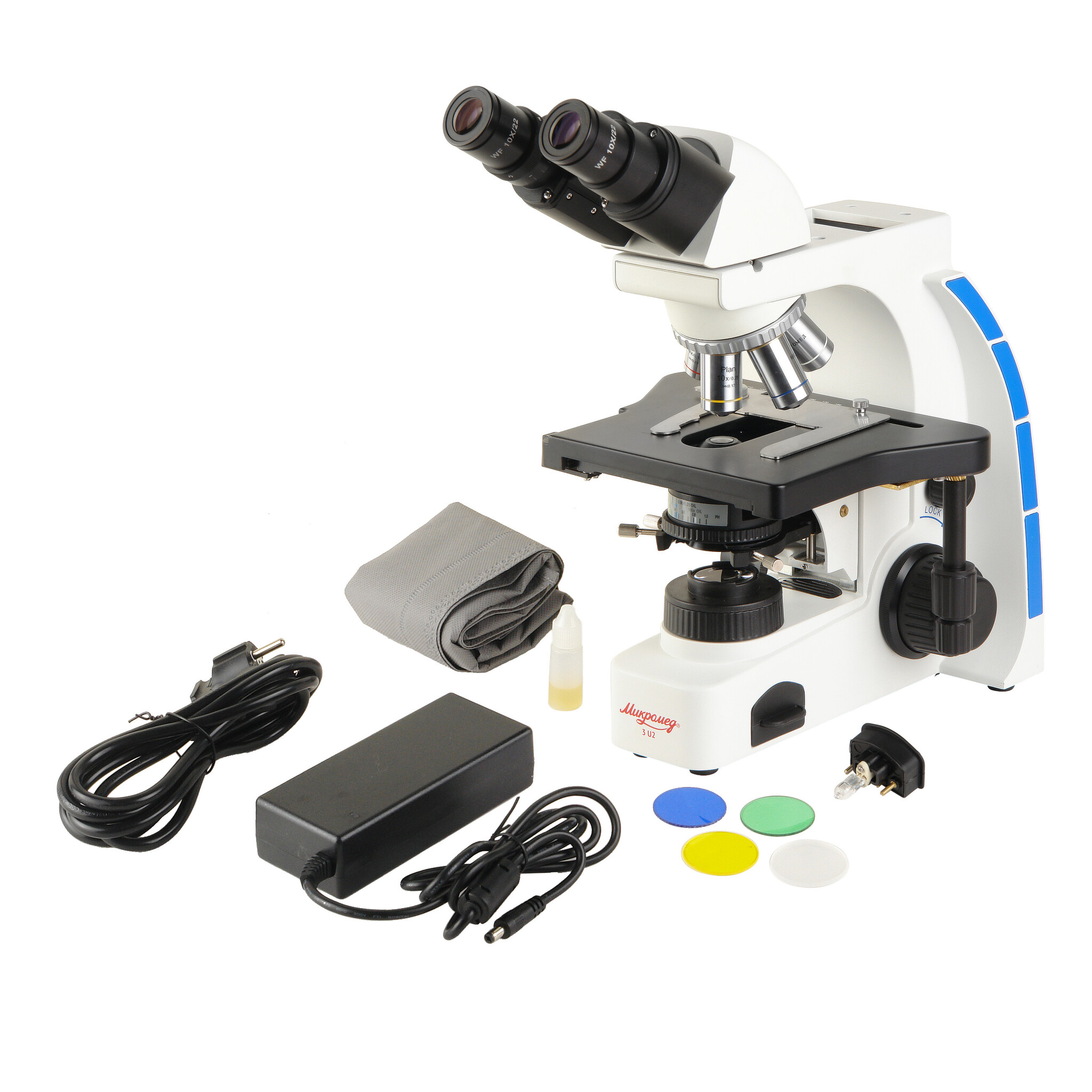 Светофильтры (белый матовый, синий, зеленый, желтый) устанавливаются на коллекторе и используются для увеличения контрастности изображения различных препаратов.