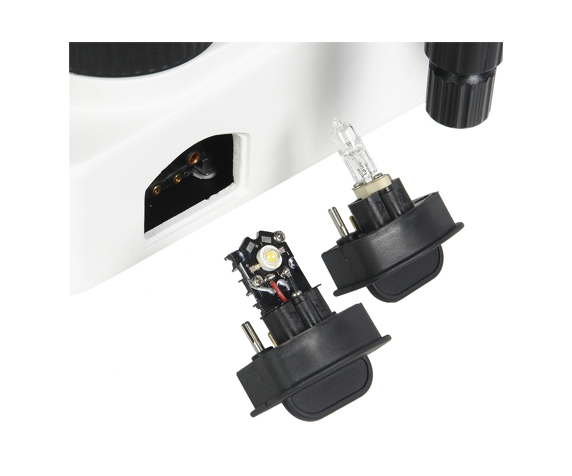 В качестве источников проходящего света в микроскопе выступают сменные осветители – галогенный и светодиодный. Галогенный осветитель будет выдавать свет, более привычный глазу. Светодиодный осветитель не нагревается и может работать длительное время. Осветители можно менять при различных исследованиях по собственному предпочтению – быстро и без дополнительных манипуляций при настройке.