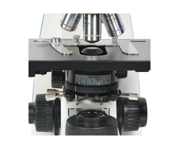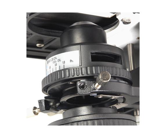 Центрируемый конденсор светлого поля Аббе с лепестковой апертурной диафрагмой помогает сформировать направленный пучок света нужного диаметра, регулируя таким образом контрастность освещения. Наибольшая числовая апертура конденсора 1,25 (на конденсор нанесена удобная шкала регулировки), диапазон перемещения по высоте – 19 мм.