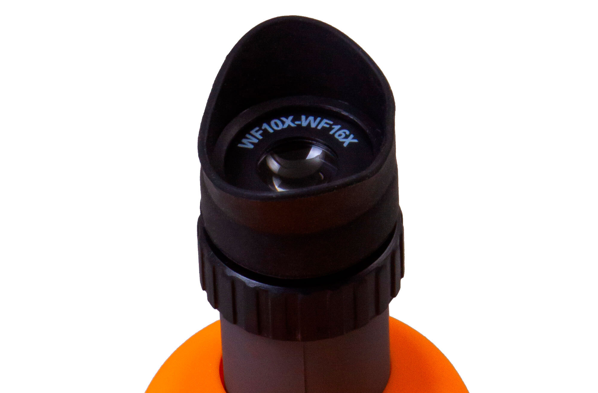 В оптической схеме используются трехгнездное револьверное устройство с установленными объективами разной кратности и двухпозиционный окуляр. Диапазон увеличений микроскопа составляет от 40 до 640 крат. Для освещения используется нижняя светодиодная подсветка. У нее есть регулировка яркости, также уровень освещенности можно регулировать диском с диафрагмами. Для питания подсветки используются стандартные батарейки (приобретаются отдельно), поэтому микроскоп можно использовать вдали от дома, например при выездах на природу. Микропрепараты фиксируются на предметном столике при помощи двух зажимов. Две ручки фокусировки позволяют точно и плавно настроить резкость и добиться наиболее четкого изображения.