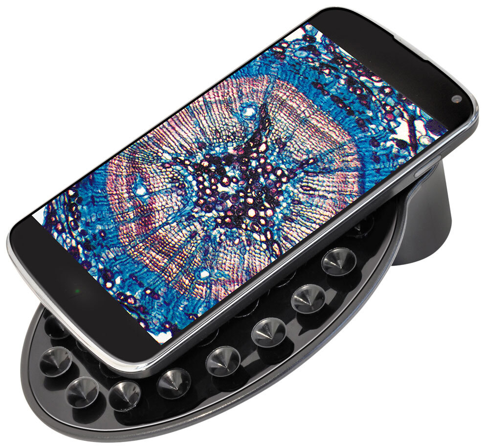 Подсветка питается от батареек (в комплекте), поэтому микроскоп не зависит от источников питания, и его удобно брать с собой в поездки. Кроме того, в комплекте есть адаптер для смартфона, с помощью которого на микроскоп можно устанавливать мобильное устройство, используя его камеру для фотографирования и видеозаписи микроисследований.