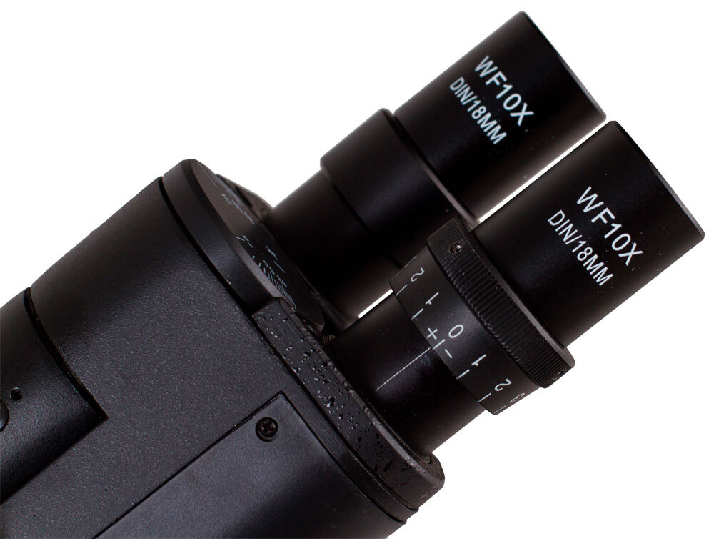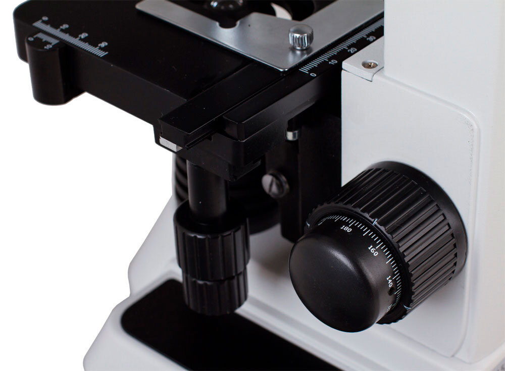 Предметный столик с нониусом снабжен препаратоводителем, ручки грубой и тонкой фокусировки обеспечивают максимально точное позиционирование объекта под объективом микроскопа. Револьверное устройство на 4 объектива и комплектные окуляры 10x обеспечивают увеличения от 40 до 1000 крат. 100-кратный объектив позволяет проводить наблюдения по методу масляной иммерсии.
