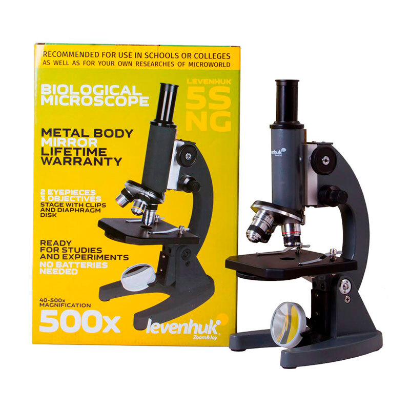 Монокулярный микроскоп Levenhuk 5S NG – простой и надежный оптический прибор, который станет хорошим помощником ребенку в учебе и научном хобби. Диапазон его увеличений составляет от 40 до 500 крат, что позволяет подробно изучать готовые микропрепараты и простейших одноклеточных – амеб, инфузорий, эвглен. Микроскопом легко управлять, поэтому ребенок сможет проводить все исследования без помощи взрослых. Так как в микроскопе используется простая подсветка-зеркало, для ее работы не требуется дополнительное питание – такая конструкция исключает контакт с электричеством.
