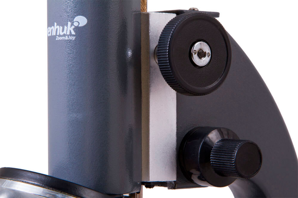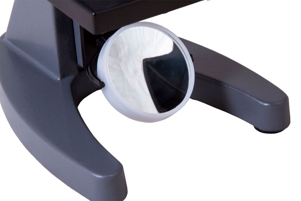 Трехгнездное револьверное устройство обеспечивает быструю смену объективов прямо во время наблюдений. В окулярную трубку можно устанавливать разные окуляры – два уже включены в комплект поставки. Предметный столик снабжен простыми препаратодержателями, предназначенными для фиксирования готовых микропрепаратов. Прямо над ним расположены ручки точной и грубой фокусировки, позволяющие плавно настраивать резкость. В качестве осветителя используется небольшое зеркало. Диск с диафрагмами позволяет регулировать интенсивность освещения.