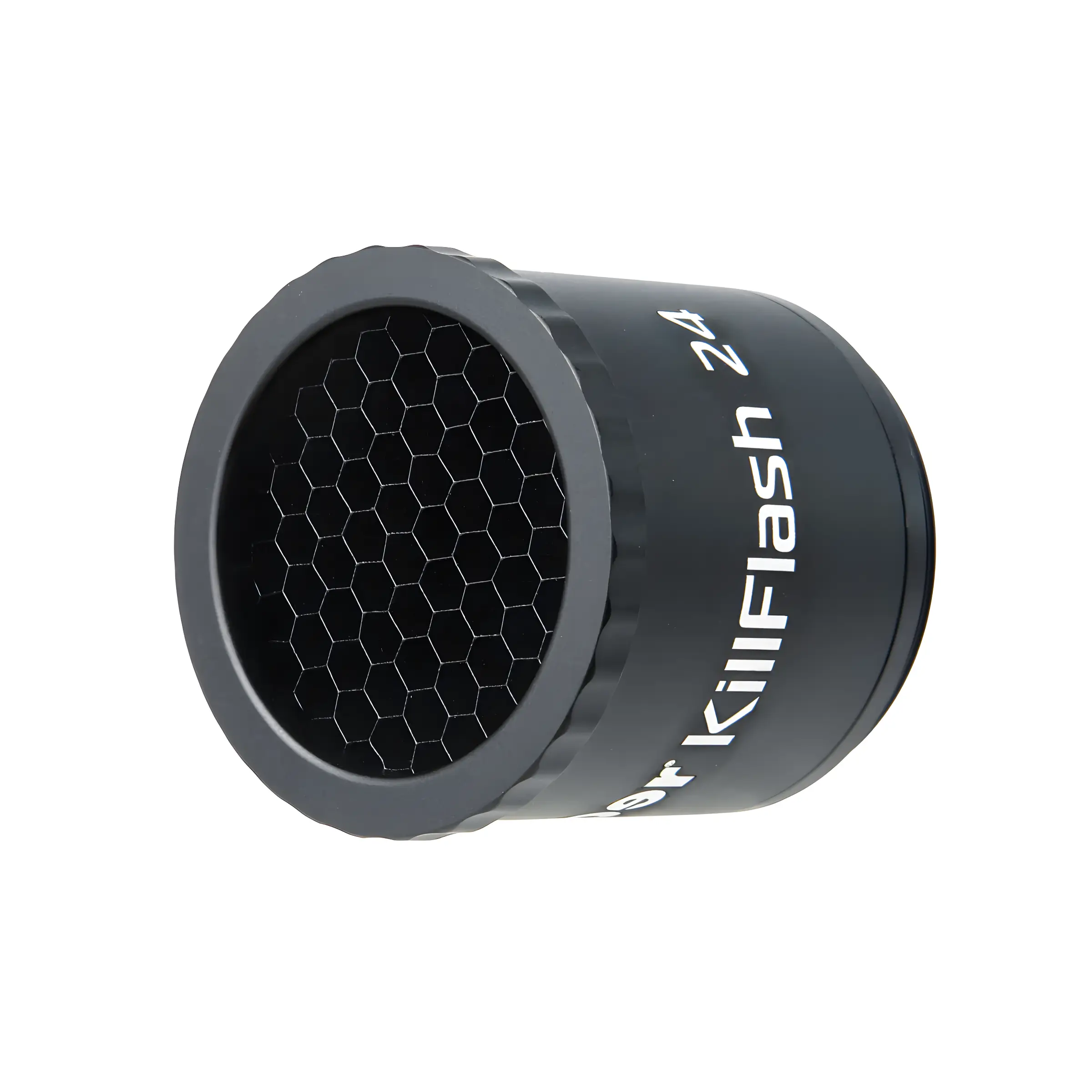 Конструктивно изделие представляет собой алюминиевую сетку с ячеистой структурой, установленную в оправу с резьбой. Насадка вкручивается непосредственно во внутреннюю резьбу объектива диаметром 24 мм — это стандартный размер для загонных прицелов (LPVO) с кратностями 1-4x, 1-6x или 1-8x. Благодаря компактности, KillFlash практически не увеличивает габариты оружия, в отличие от длинных трубчатых бленд.