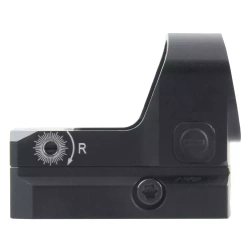 Красная «точка» 3 MOA. Автовыключение питания. Для ввода поправок и корректировки СТП используются два винта под плоскую мини-отвёртку. Яркость метки регулируется вручную, кнопками «+/-» по бокам корпуса. Доступно 8 уровней для стрельбы при дневном свете и 2 уровня для сумерек и совместной эксплуатации с ПНВ. Включается сетка мгновенно, за 1 секунду, а выключается либо принудительно, длительным нажатием кнопки «-», либо автоматически после 4 часов бездействия. Для питания нужна 1 батарейка CR2032, которой при среднем уровне яркости «5» хватает минимум на 5 лет непрерывной работы.
