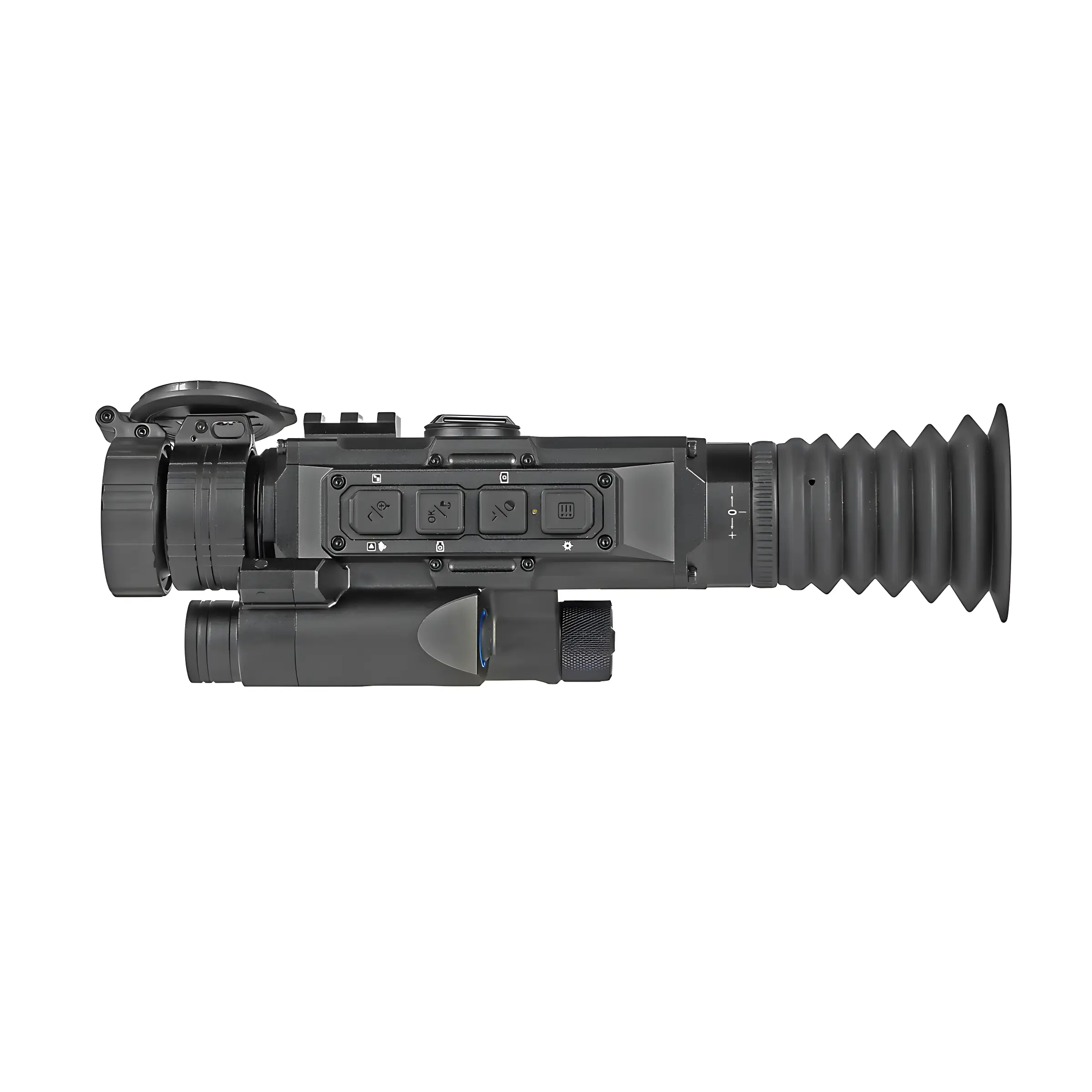Качество изображения обеспечивает 4K-матрица в связке с технологией усиления света VLEA. Чувствительность сенсора составляет 0.001 люкс, благодаря чему прицел позволяет видеть детали в глубоких сумерках даже без включения подсветки. Картинка выводится на круглый IPS-дисплей с разрешением 800x800 пикселей. Это решение убирает «туннельный эффект» и обрезку углов, свойственную прямоугольным экранам, сохраняя привычное для стрелка поле зрения. Оптическая система построена на объективе диаметром 23 мм с фокусным расстоянием 50 мм, что дает базовое увеличение 4x. С помощью ступенчатого цифрового зума (1.5х/2х/3х/4х) общую кратность можно поднять до 16x, а фокусировка возможна уже с дистанции 5 метров.