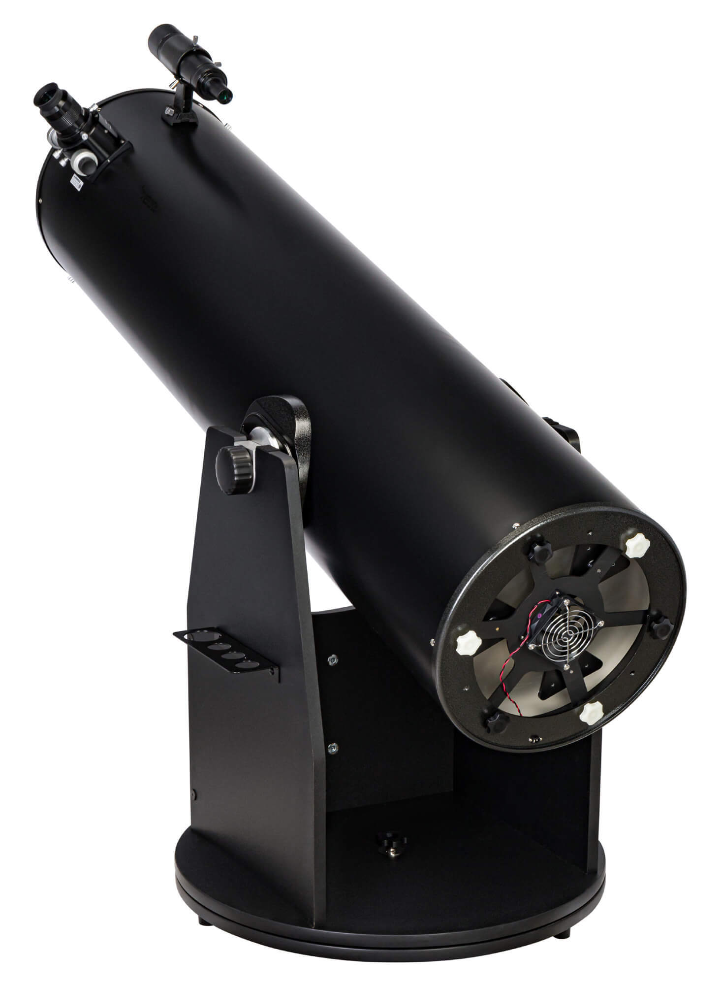 На тыльной стороне трубы расположен вентилятор. Он используется для ускорения термостабилизации главного зеркала. В обычных условиях, чтобы сравнять температуру оптики с температурой окружающей среды, может понадобиться несколько часов. Но активное охлаждение сократит это время практически вдвое. Вентилятор работает от батареек, которые приобретаются отдельно.