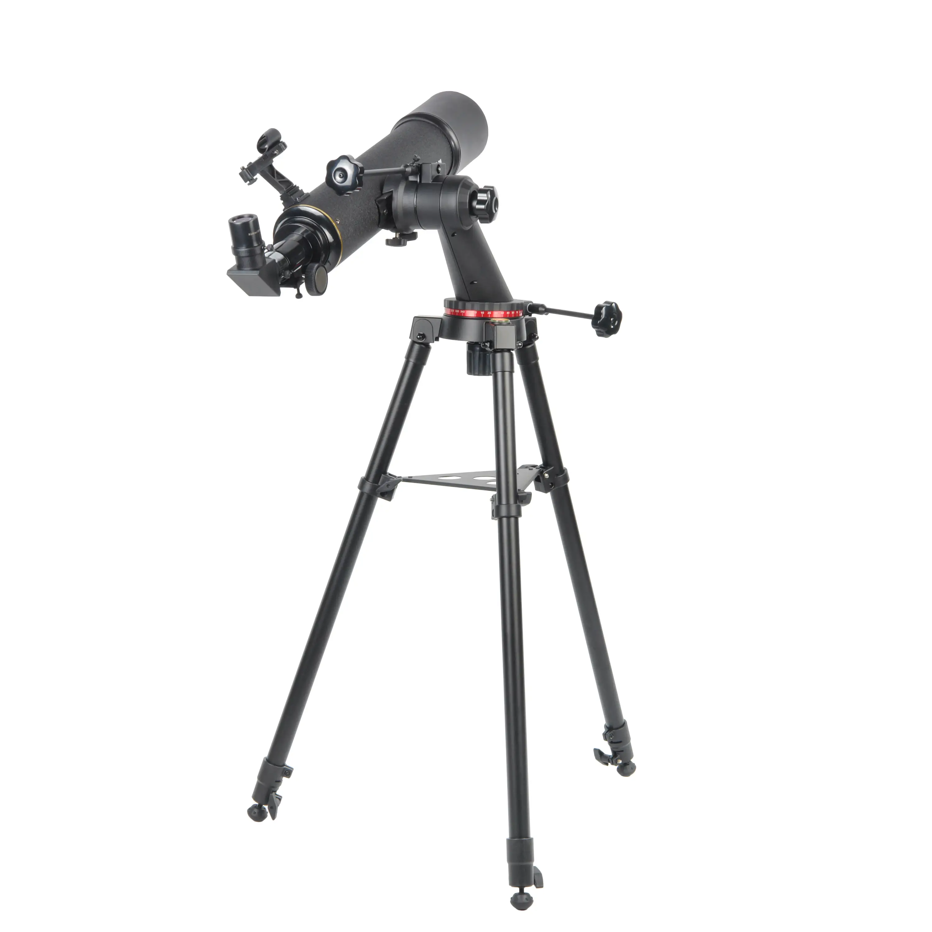 Конструкция базируется на металлической трубе и жестком металлическом штативе, вес одной только треноги составляет 3.8 кг, что обеспечивает необходимую устойчивость. Объектив защищен глубокой несъемной блендой, которая предотвращает выпадение росы и отсекает боковую засветку. Высота штатива регулируется в диапазоне 72–124 см, а полочка для аксессуаров придает дополнительную жесткость. Для адаптации к разным поверхностям резиновые опоры выкручиваются, обнажая шипы для надежной установки на грунт.