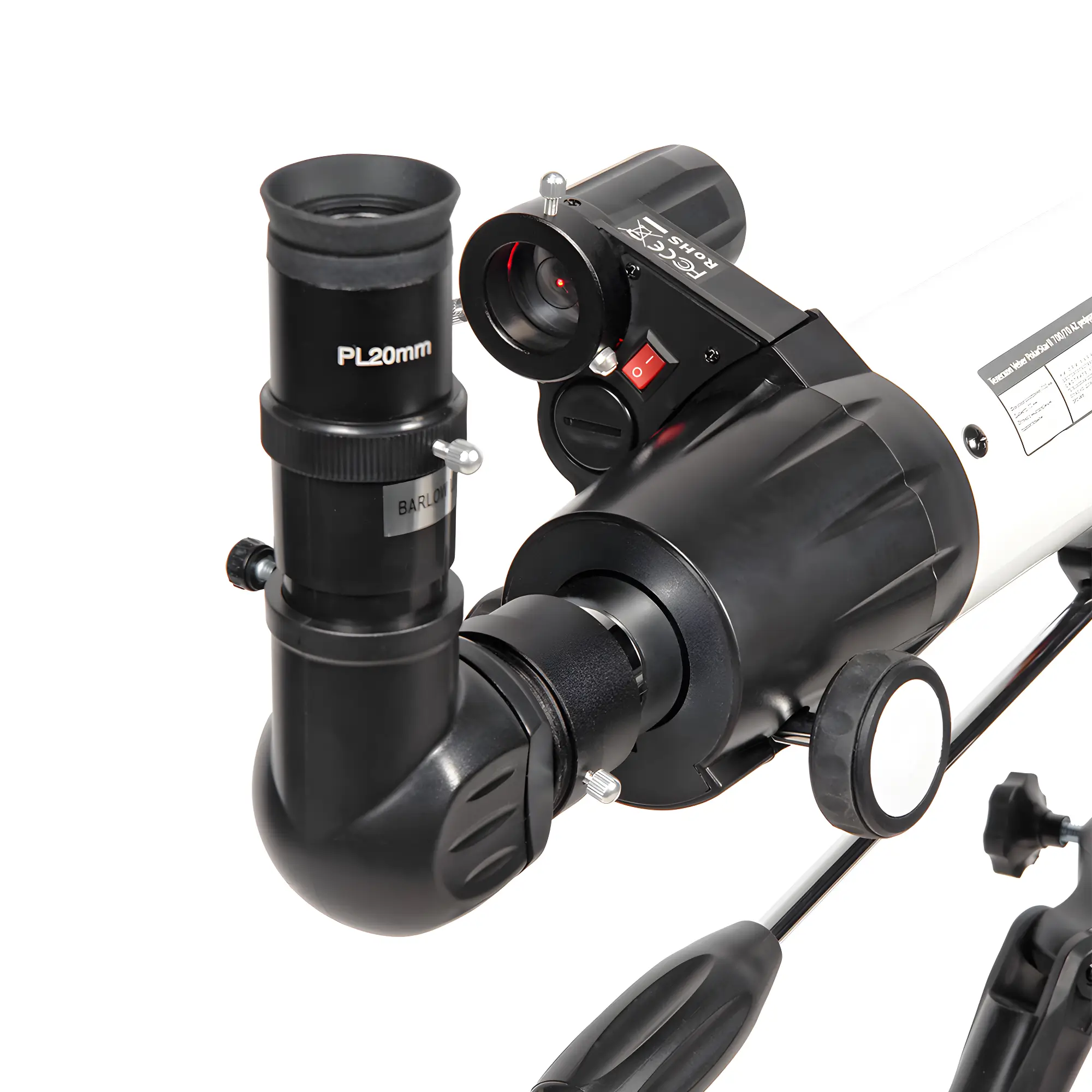 В коробке находятся два окуляра: PL20 для обзорных наблюдений (35x) и PL10 для более детальных (70x). Комплектная линза Барлоу 3x утраивает эти значения, позволяя достичь увеличения до 210x при идеальных атмосферных условиях. Быстрое наведение на цель обеспечивает искатель типа Red Dot с регулируемой яркостью, а резкость настраивается плавным реечным фокусером стандарта 1.25 дюйма.